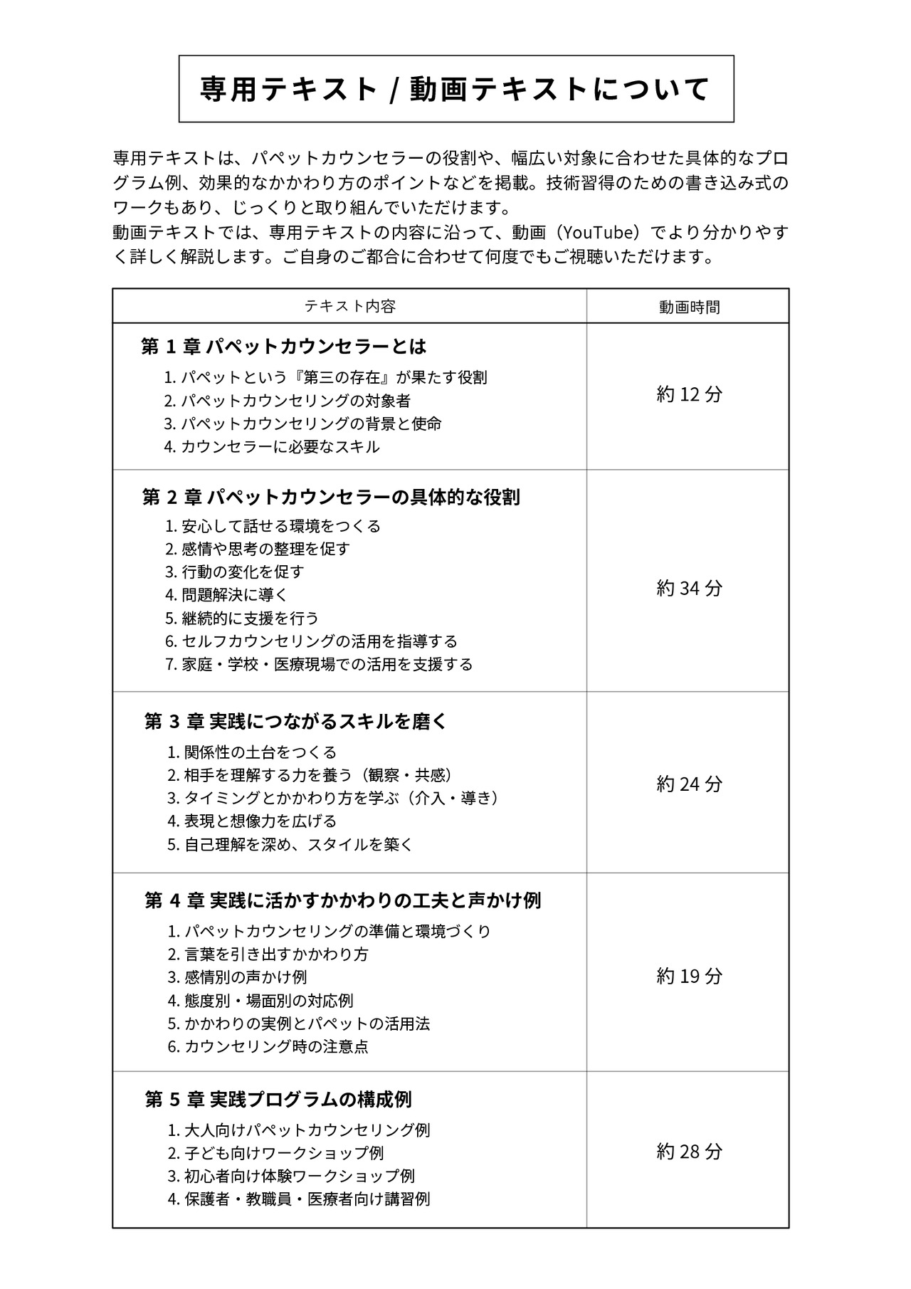 パペットカウンセラーの役割や、技術習得のためのワーク、幅広い対象に合わせた具体的なプログラム例、効果的なかかわり方のポイントなどを解説しています。